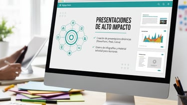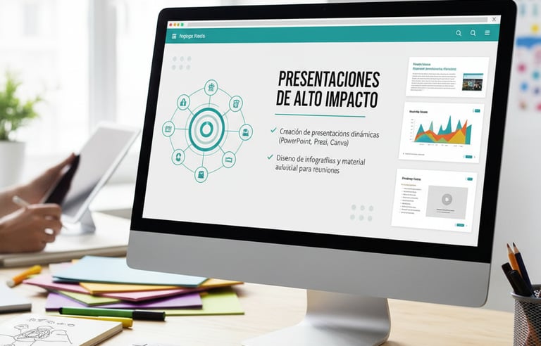 Creación de presentaciones dinámicas (PowerPoint, Prezi, Canva), diseño de infografías y material audiovisual para reuniones.
